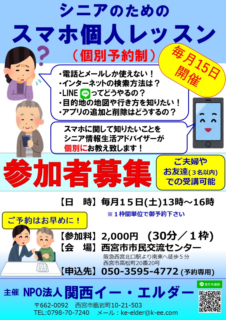 シニアのためのスマホ個人レッスン(毎月15日午後開催)内容シニアのためのスマホ個人レッスン(30分)です。スマホに関して知りたい事・困っている事など、個別になんでもお聞きください。日時毎月15日の午後に開催しています。 ①13:00~13:...